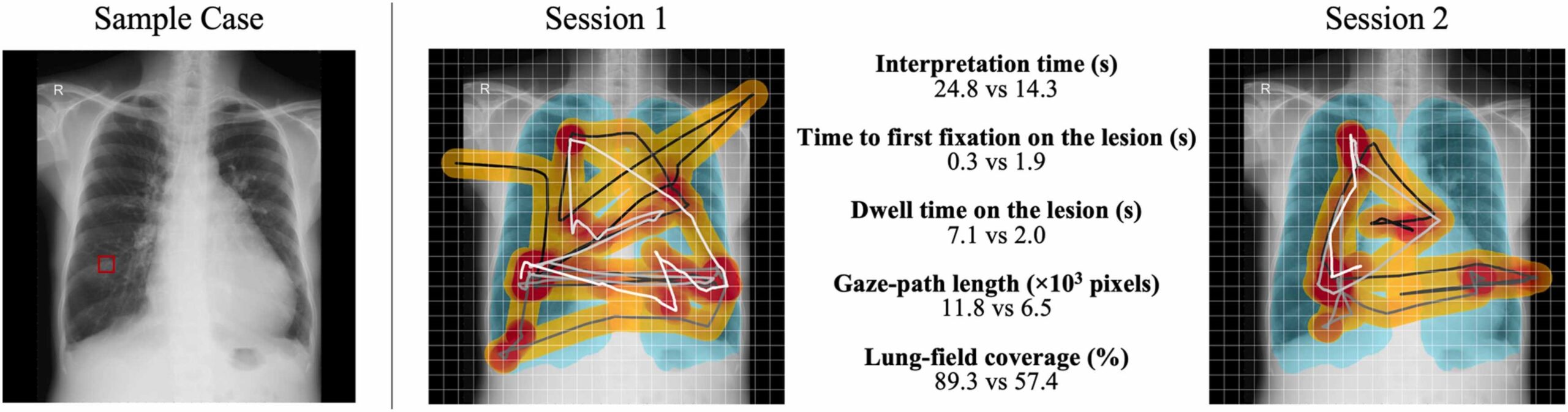 この論文は、胸部X線AIの枠表示が、医師の診断結果だけでなく、画像の見方そのものを変えることをアイトラッキングで示した研究です。AIがあると病変には早く気づける一方で、その後の確認はむしろ丁寧になり、読影時間はやや長くなっていました。